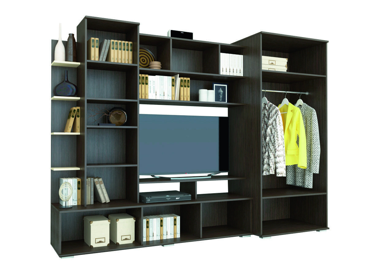 Стенка КАИР является ярким примером оптимального соотношения цены и качества. Просторные шкафы, вместительные тумбы и обилие открытых полок позволят разместить все самое необходимое на ограниченном пространстве, а стильный инновационный дизайн этого гарнитура станет прекрасным дополнением к интерьеру современной гостиной или кабинета. Собирается только в одном исполнении.