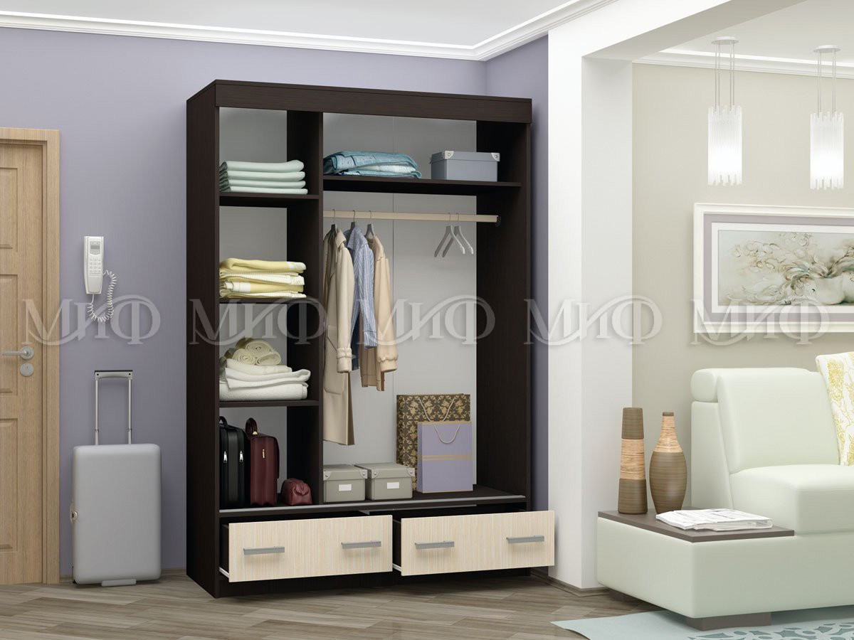 Удобная и красивая мебель для интерьера холла или спальной комнаты. Раздвижные двери шкафа-купе с пескоструйным рисунком. Оборудован выдвижными ящиками и большим зеркалом по центру. Шкаф-купе с зеркалом и 2-мя выдвижными ящиками, исполняемых в двух цветовых решениях - Венге/Белфорт и Сонома/Венге.