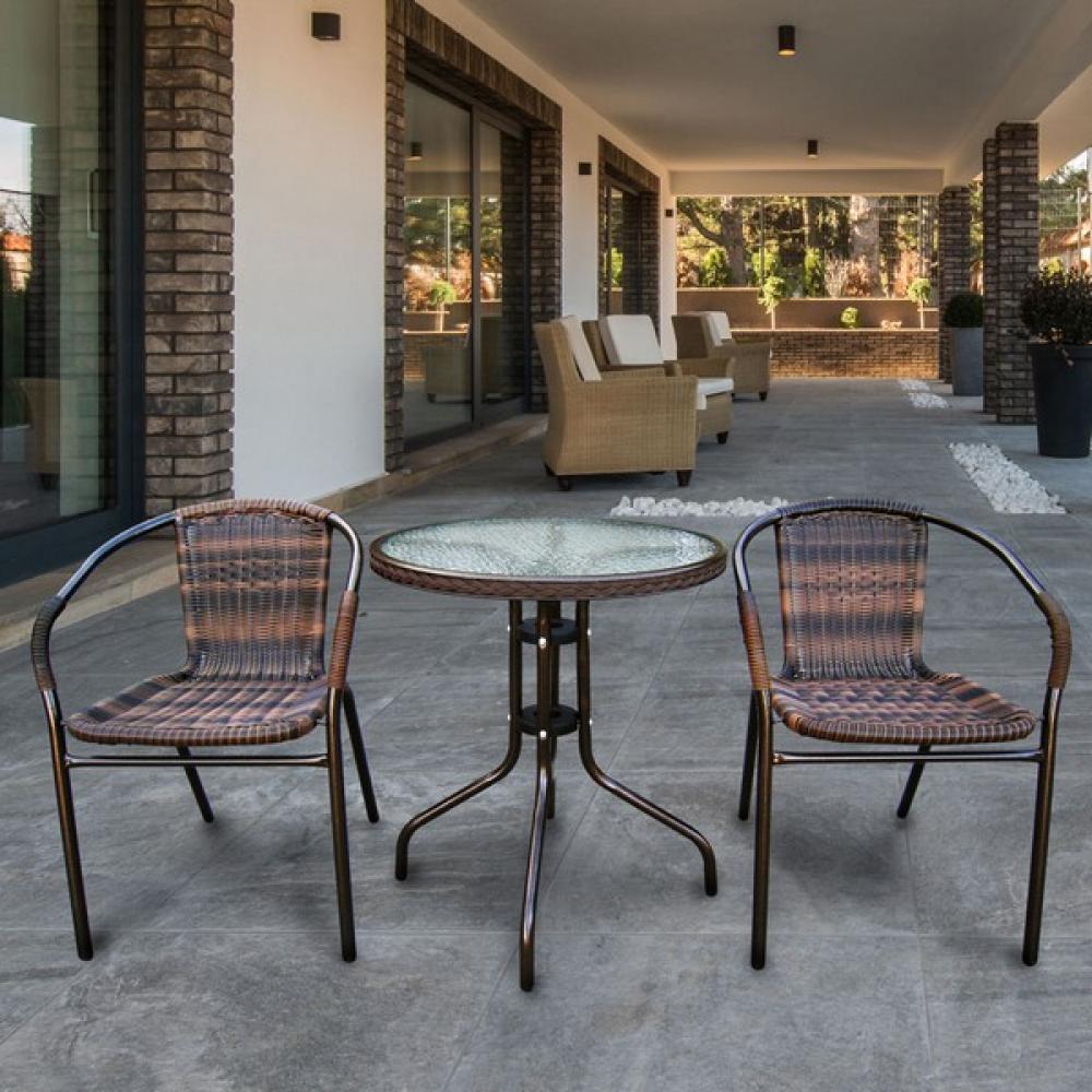 Стол: D60xH70 см. Стекло: закаленное- 5 мм. Труба: сталь D25 с полимерным покрытием. Столешница по периметру искусственный ротанг. Стул: W54хD58xH74 см. Каркас: труба сталь D25.Материал: искусственный ротанг. Цвет:орех(В) Объем и вес комплекта: 0,32м3,13,8кг.